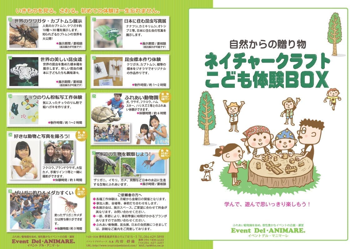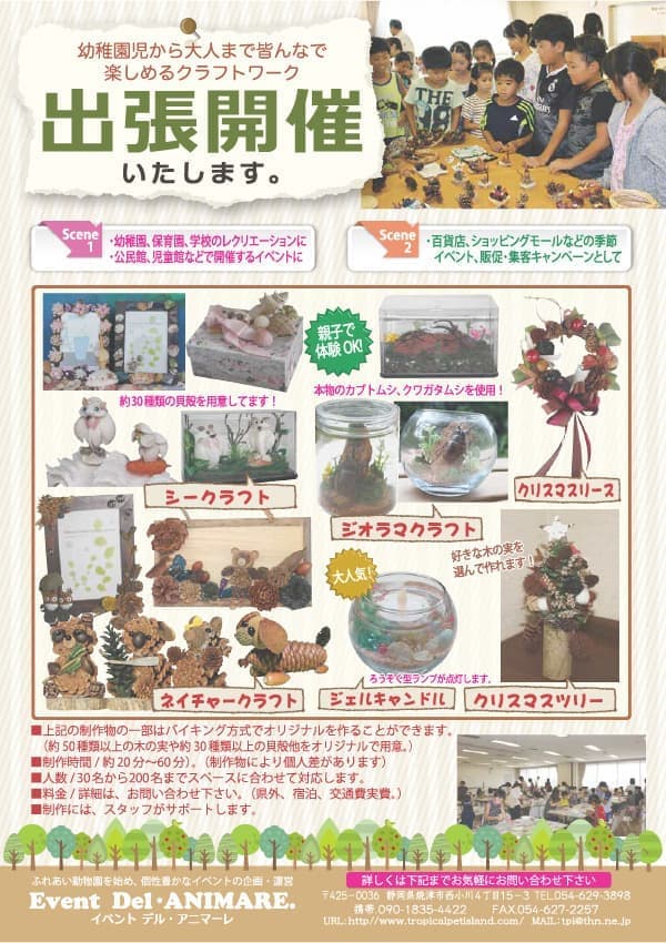 多彩な動物達を取り扱う中で「ふれあい動物園」の依頼が増え始め、平成10年頃からは、ふれあい動物園以外の工作教室や各種展示イベントに対応するイベント会社「イベント デル アニマーレ」を設立。