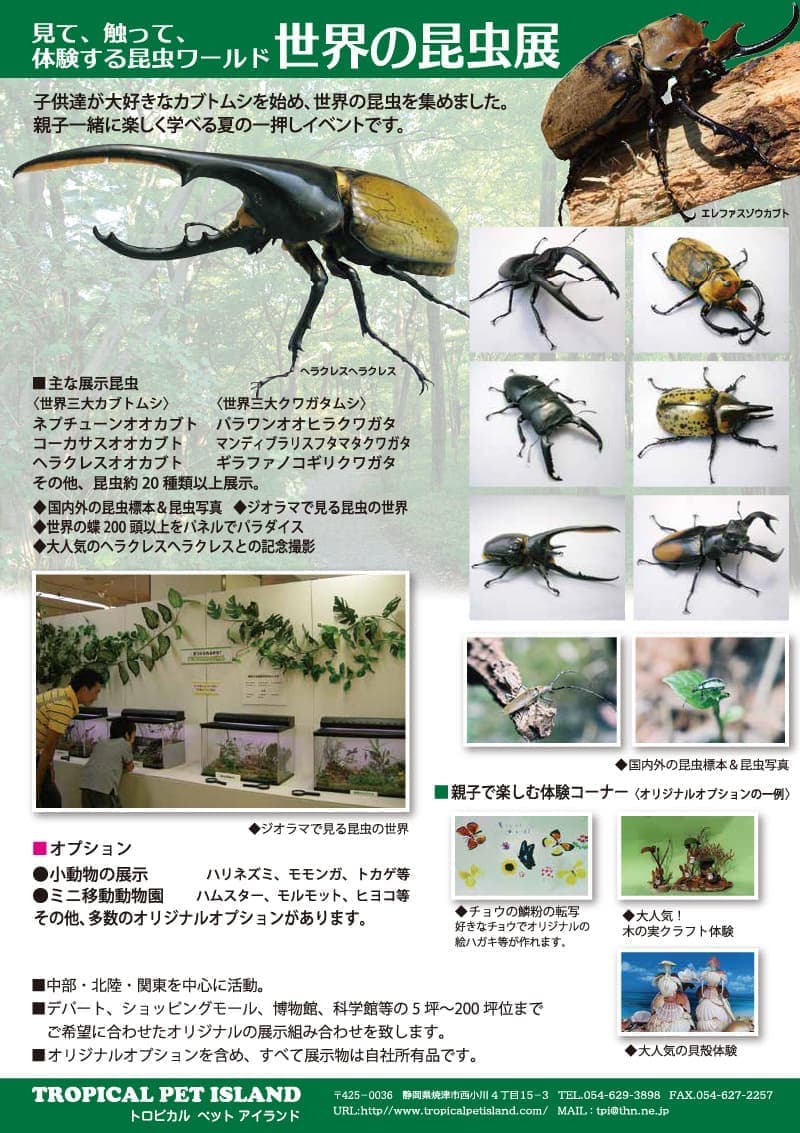 | 【同時開催】 | ※別途料金 要相談 ❶かわいい小動物達の展示 ※詳細は、打ち合わせとなります。 ❷夏休みの工作体験コーナー 貝殻や木の実を使用したネイチャークラフトの工作。オリジナル作品が作れます。 ❸記念写真コーナー 大人気のヘラクレス、ネプチューン等と一緒に記念撮影が出来ます。 ❹チョウの鱗粉転写 チョウの羽の鱗粉(りんぷん)をハガキに写し取り、暑中見舞いを作ります。 ❺昆虫の標本ジオラマ作り 本物の昆虫でケースの中にジオラマを作ります。 その他にもオプションを用意してます。 ※上記の昆虫展に関わる設備、展示品、オプション資材等は、全て自社所有管理しています。 |
