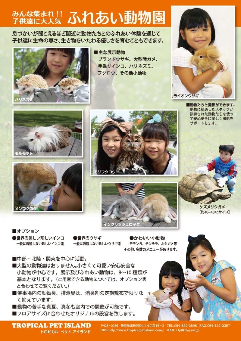 | 【基本プラン】 | 1.ウサギ(色々な種類をご用意します) 5~8頭 2.ハムスター(安全な子供のみです) 50~100匹 3.モルモット 5匹 4.ハリネズミ 3~5匹 5.ヒヨコ 100羽 6.フクロウ 2羽 7.大型陸ガメ(50kg) 1匹 8.インコ 数羽 9.手乗りバト 数羽 10.その他 要相談 ※2日間以上の開催には、保健所への登録料15,000円が別途必要となります。 |