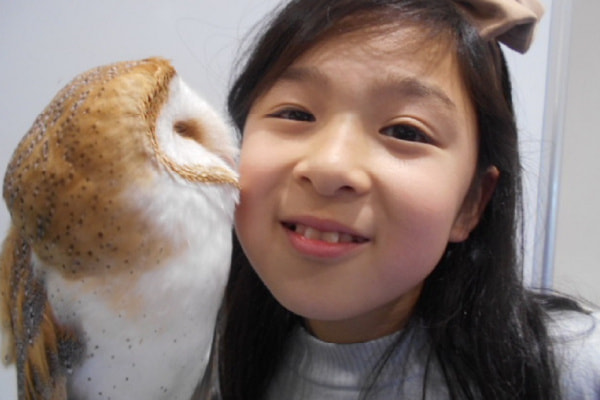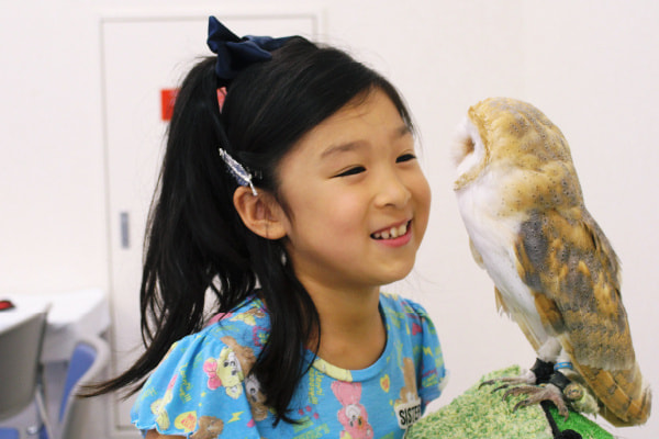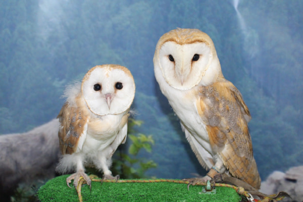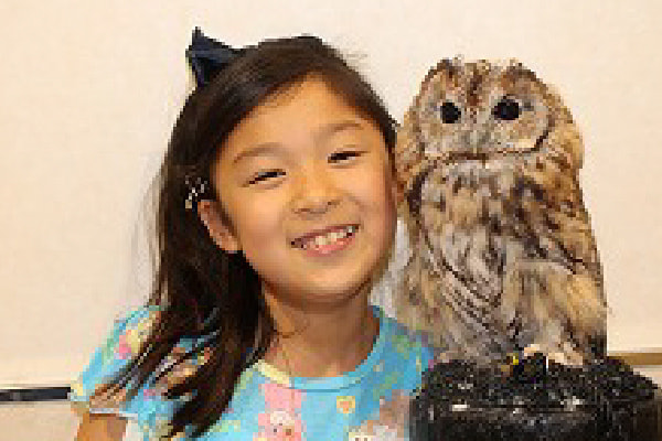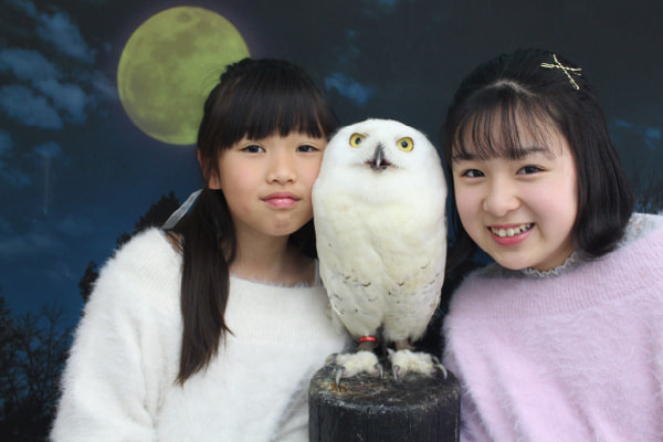 月夜のイメージのバックパネルでシマフクロウと記念撮影(シマフクロウ7月〜10月は、暑さに弱いため室外での撮影はできません)