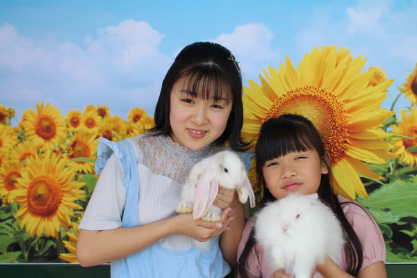 ひまわり畑のバックパネルでウサギと記念撮影